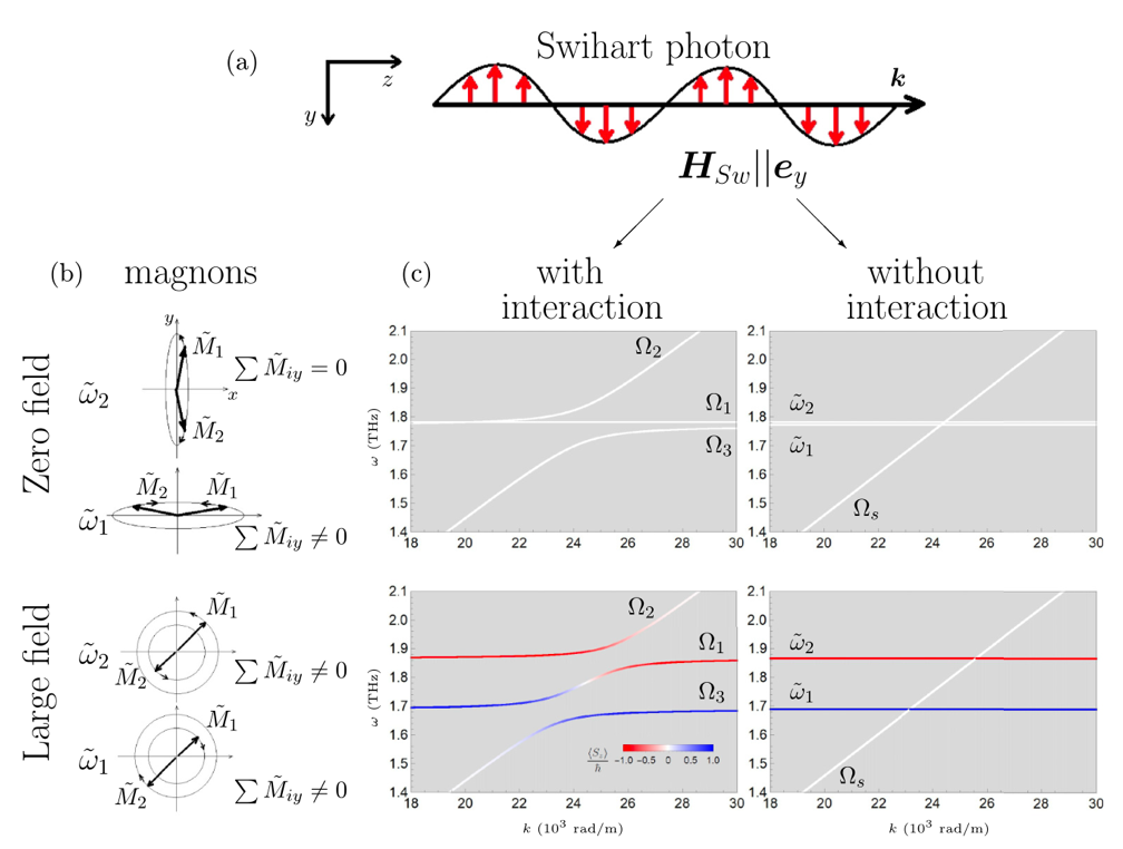 图2:S/AF/S异质结构中的磁子-极化子。(a) Swihart光子在超导谐振腔中传播时的磁场分布图。(b) 零磁场和强外加磁场 H0 = H0ez下,反铁磁磁子本征模的磁化进动示意图。(c) S/AF/S异质结构中杂化本征激发的色散关系:左图为无相互作用情况,右图为相互作用情况。
